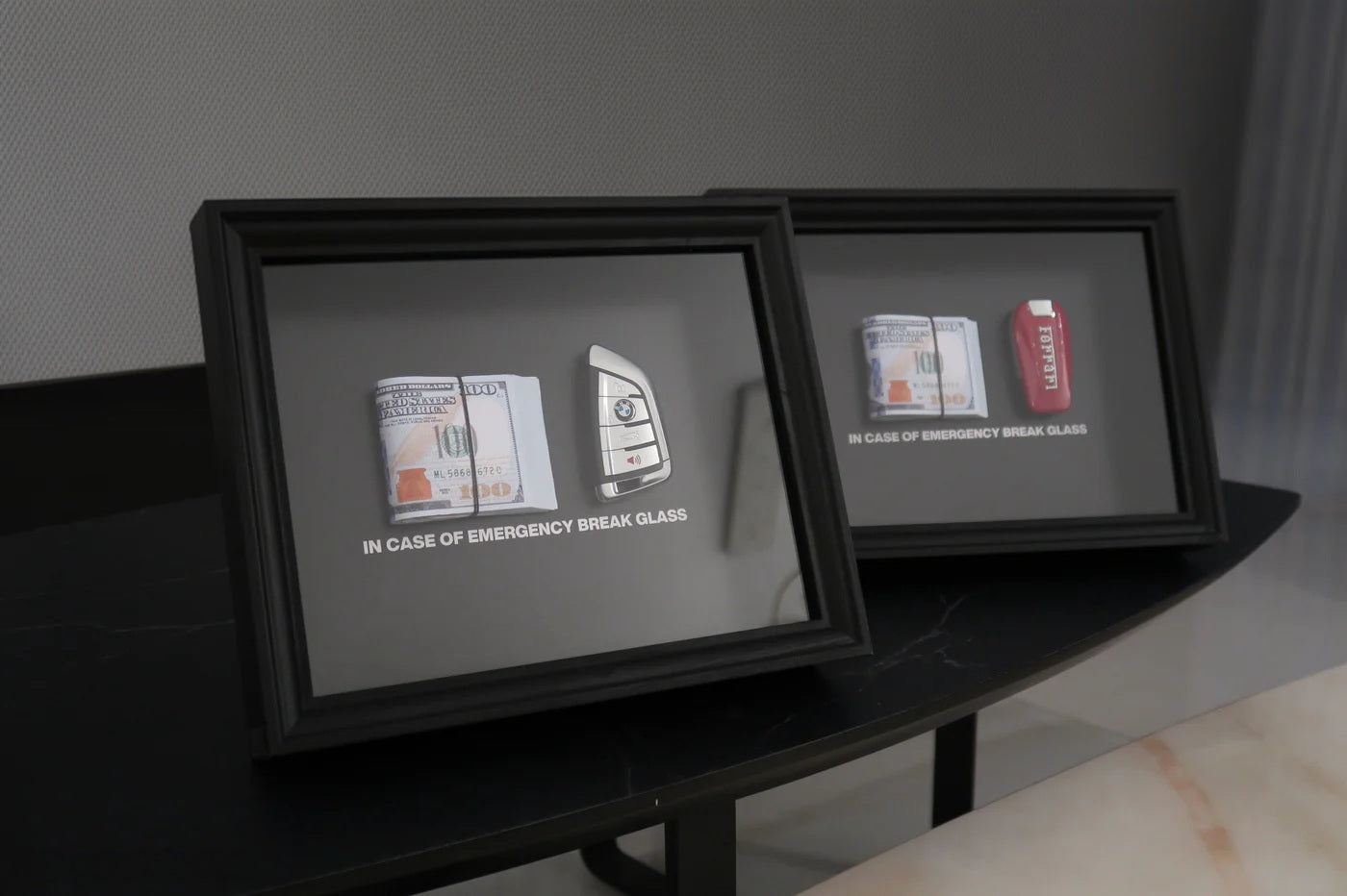 This luxury frame piece is the ultimate statement for high achievers, dreamers, and those who play life on sport mode. Featuring a Ferrari smart key replica and a stack of $10,000 prop money, it’s the perfect addition to your office, home, or car interior.