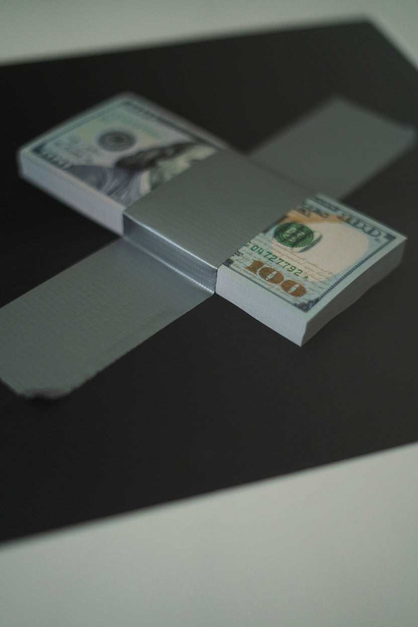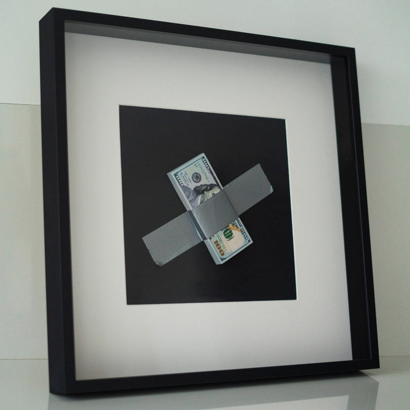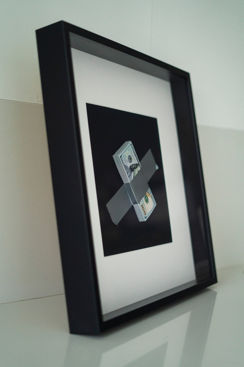 - Design: 3D framed stack of premium replica USD notes, duct-taped on matte black backing