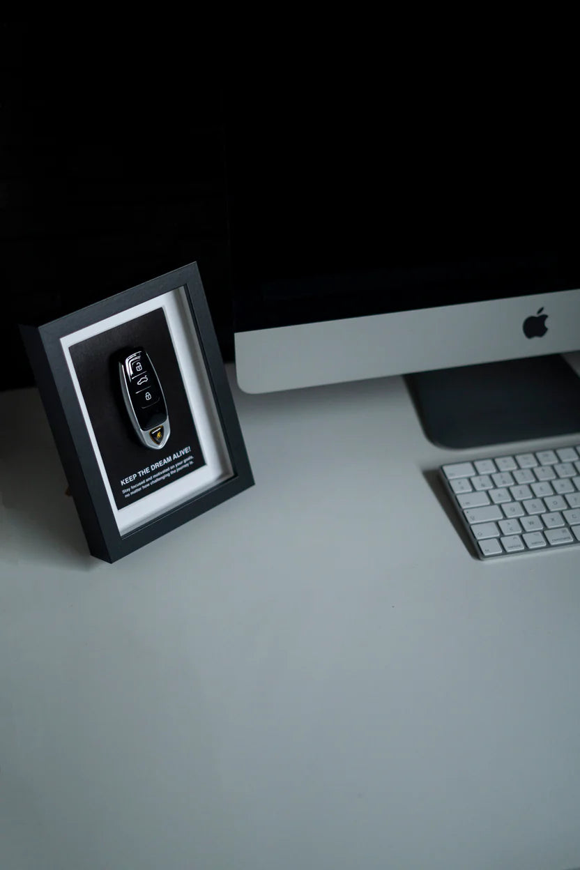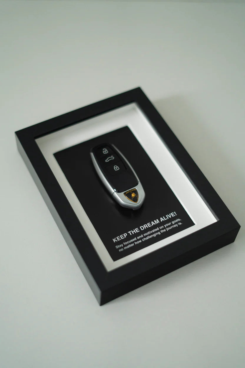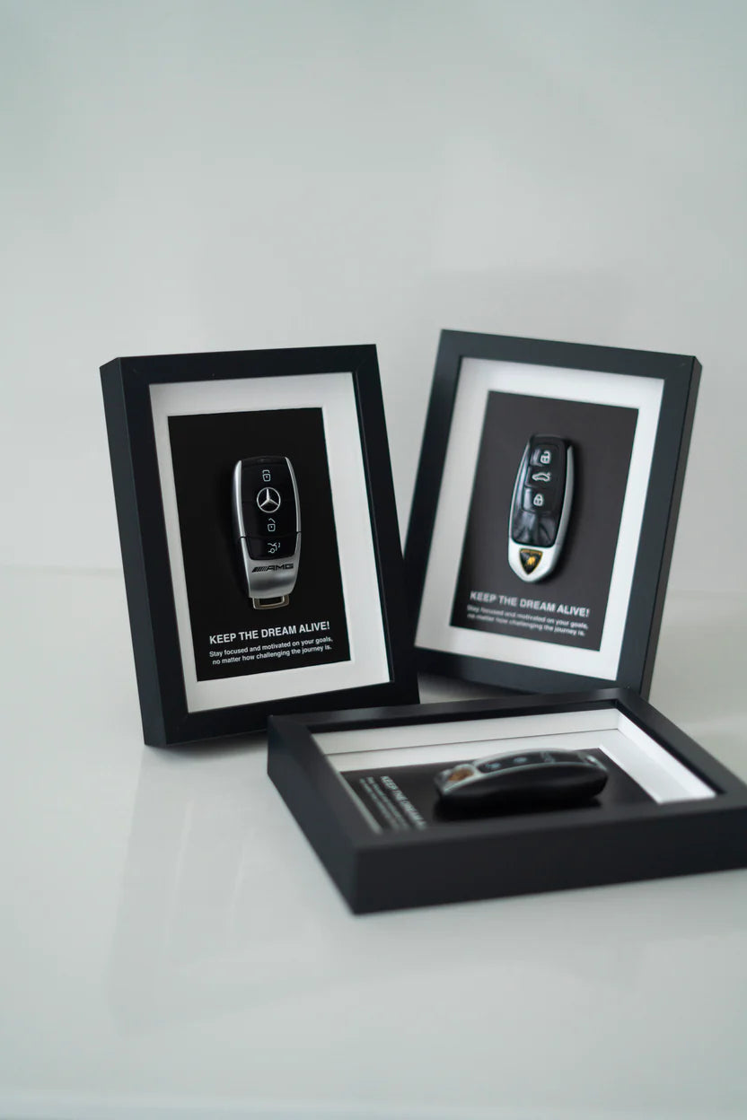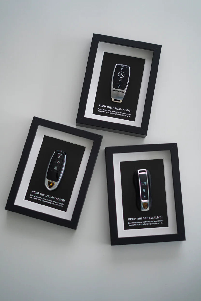 Each frame features a hyper-realistic luxury car key replica (Lamborghini, Porsche, Mercedes-Benz AMG) mounted above the bold quote: