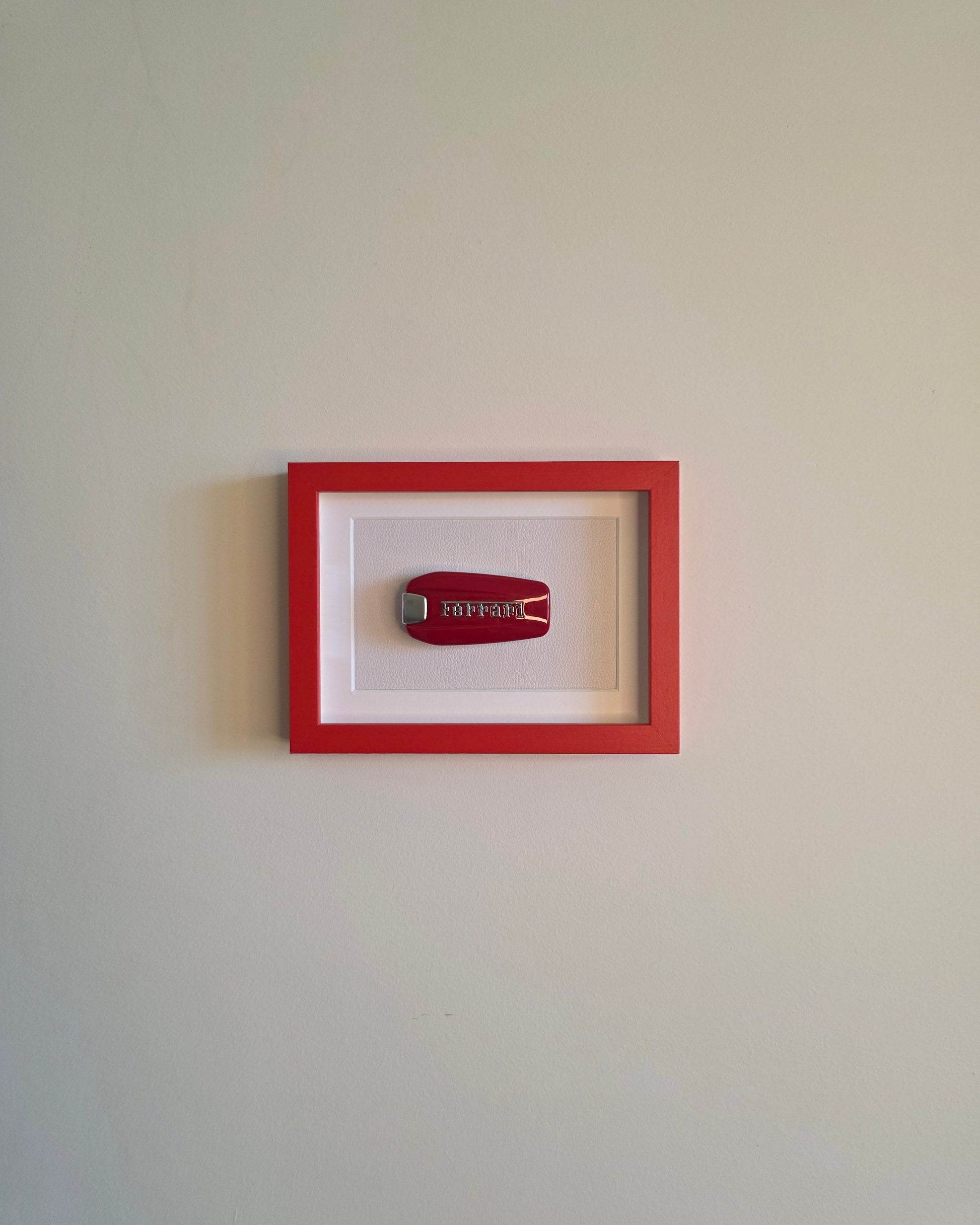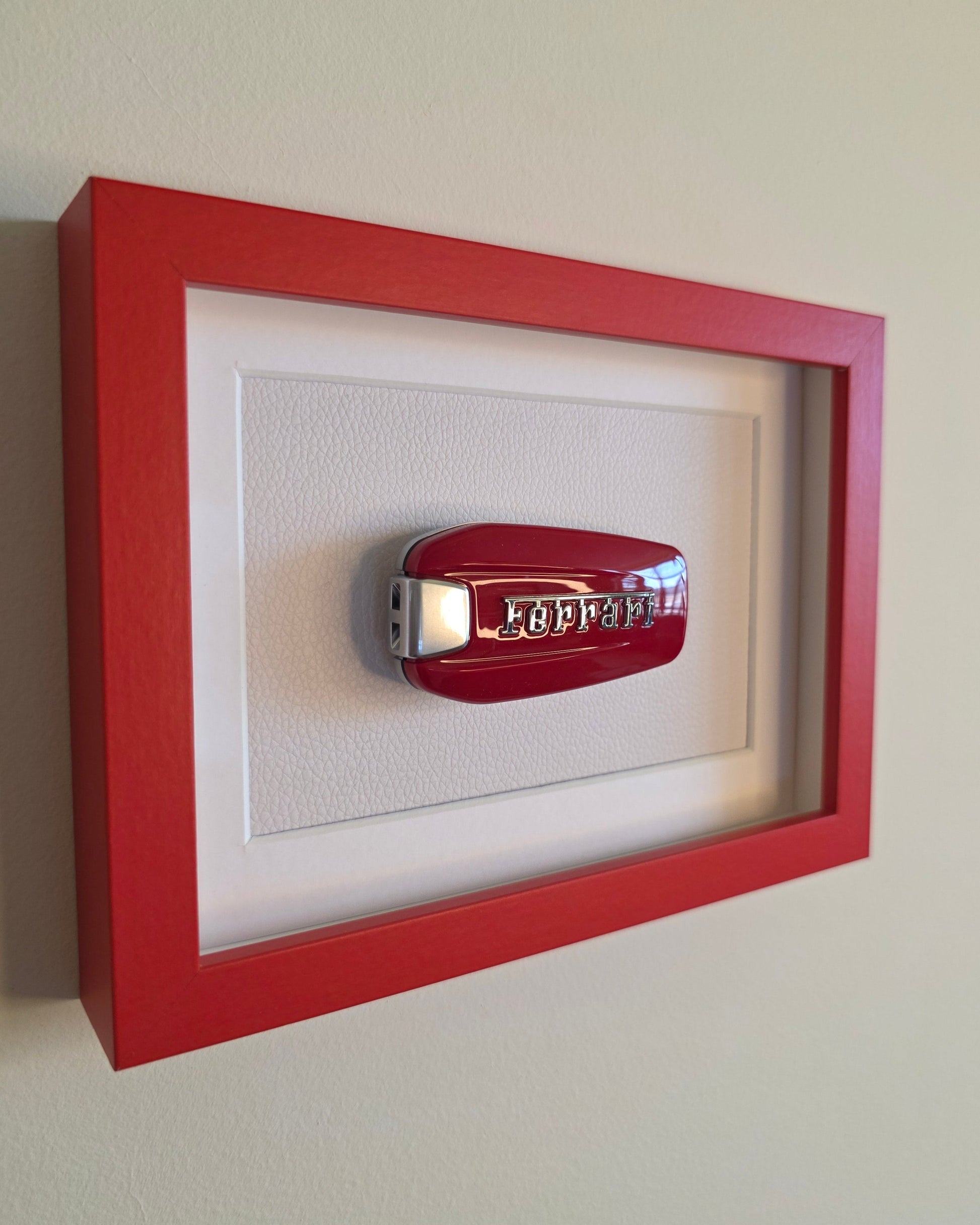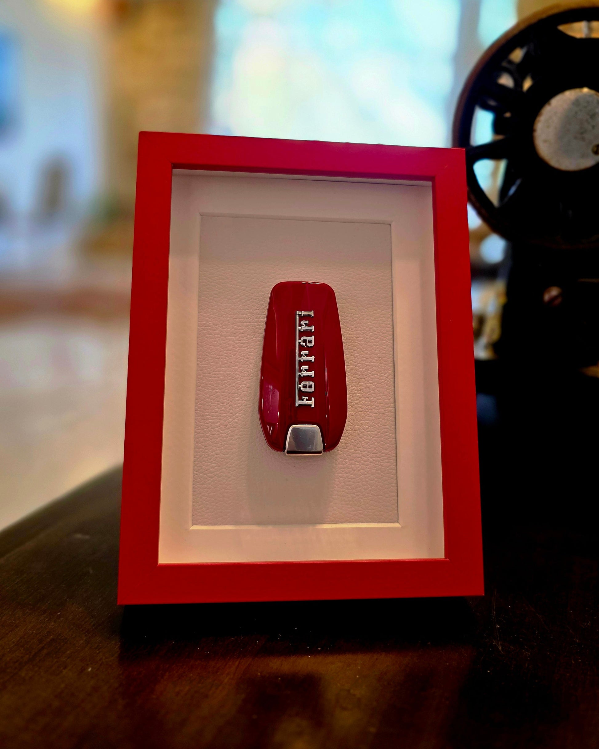 A real Ferrari key, encased in a handcrafted red wooden frame, resting on premium white leather — a powerful symbol of speed, luxury, and drive. Every time your eyes land on it, you're reminded: