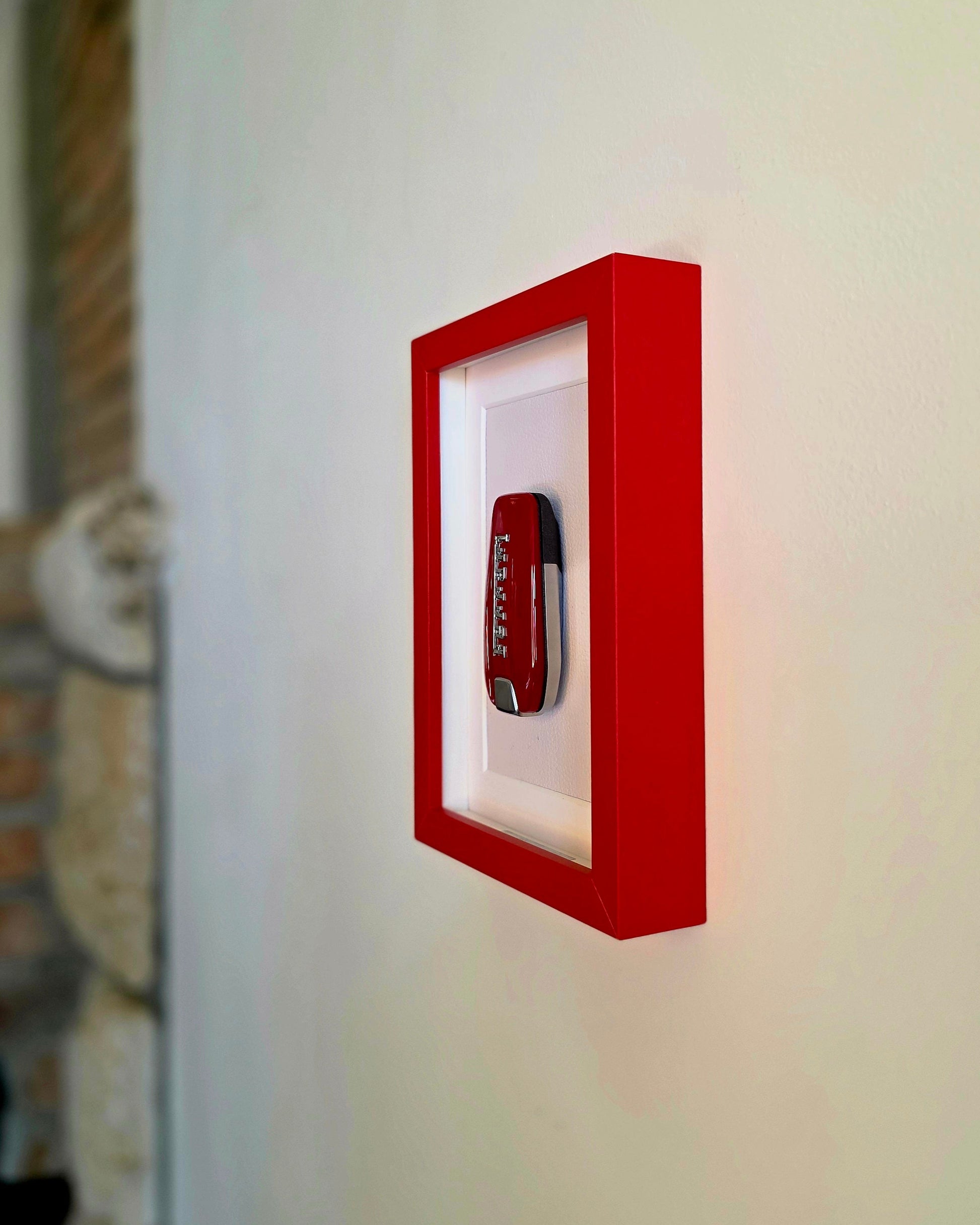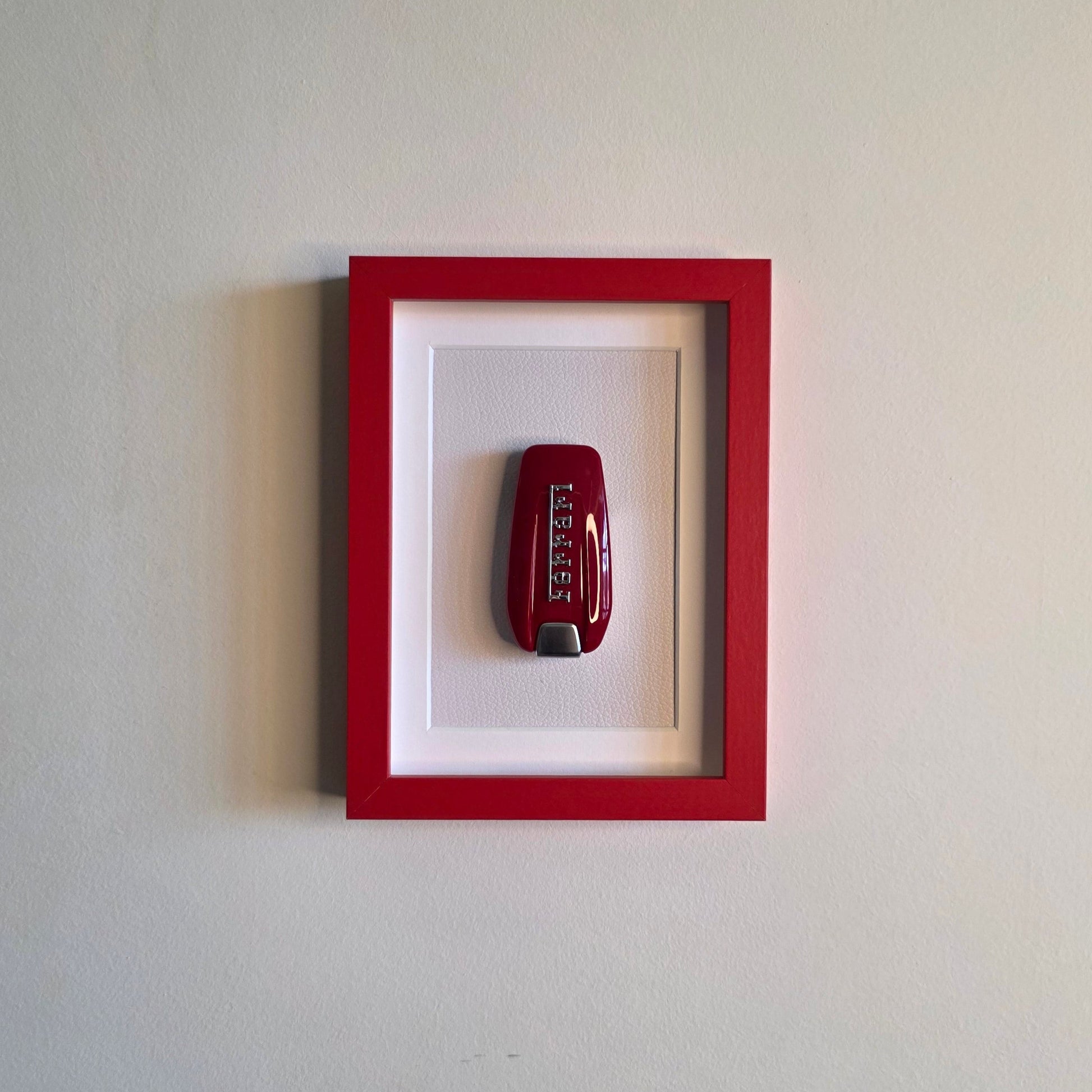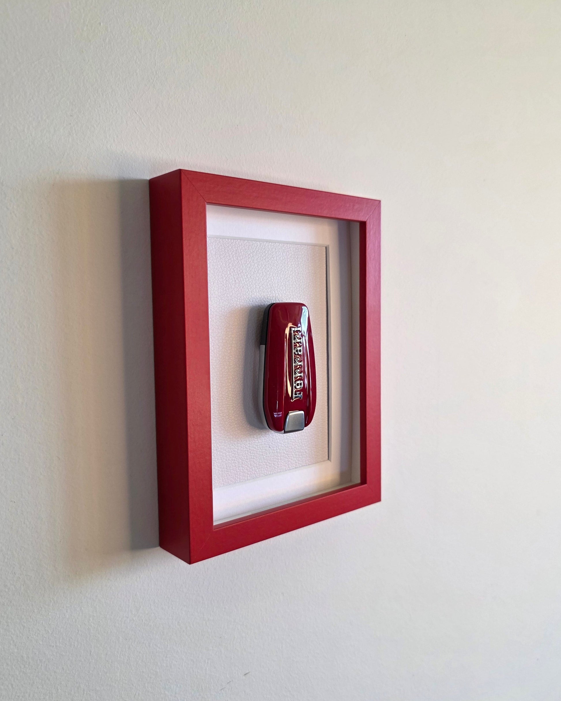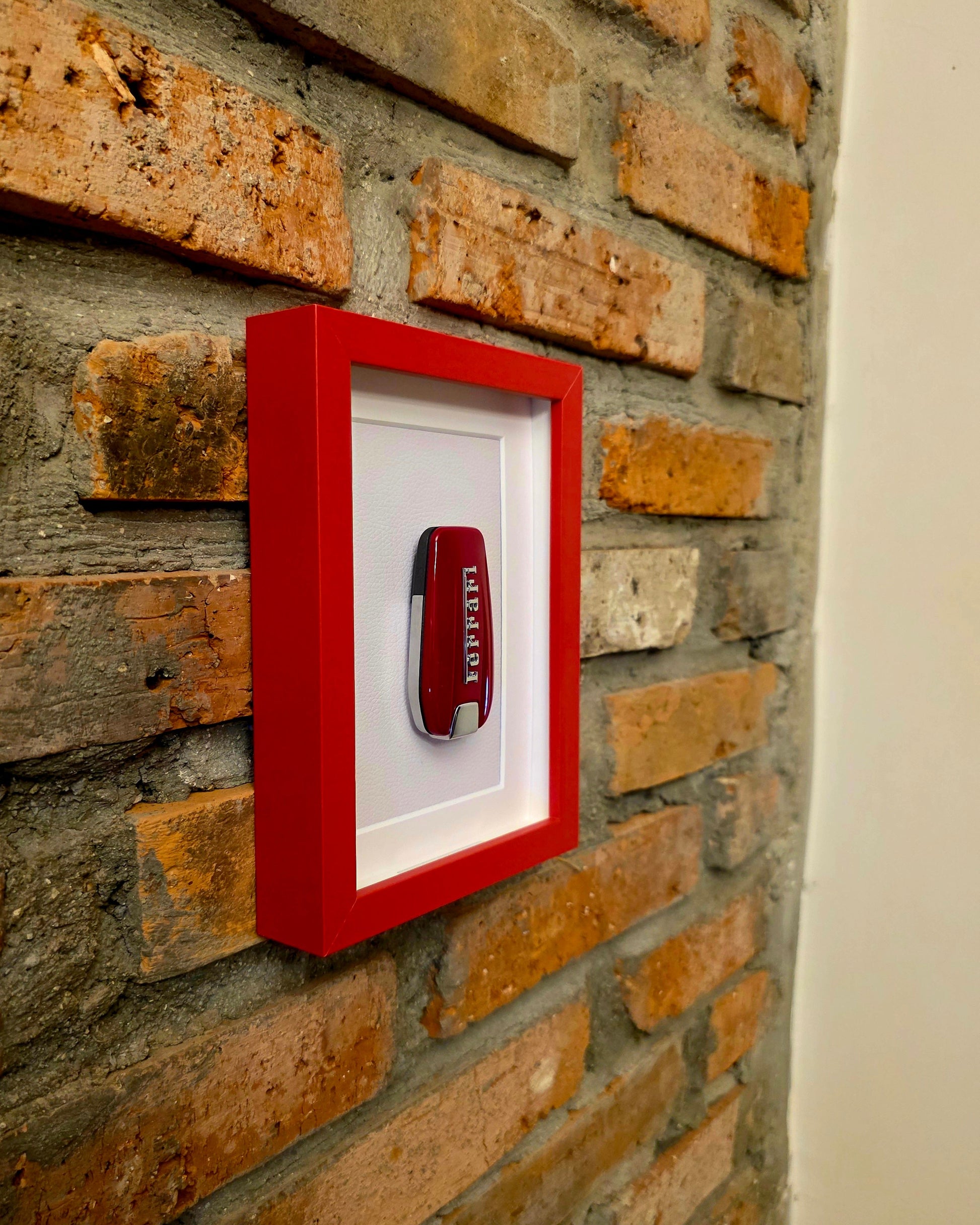 A real Ferrari key, encased in a handcrafted red wooden frame, resting on premium white leather — a powerful symbol of speed, luxury, and drive. Every time your eyes land on it, you're reminded: